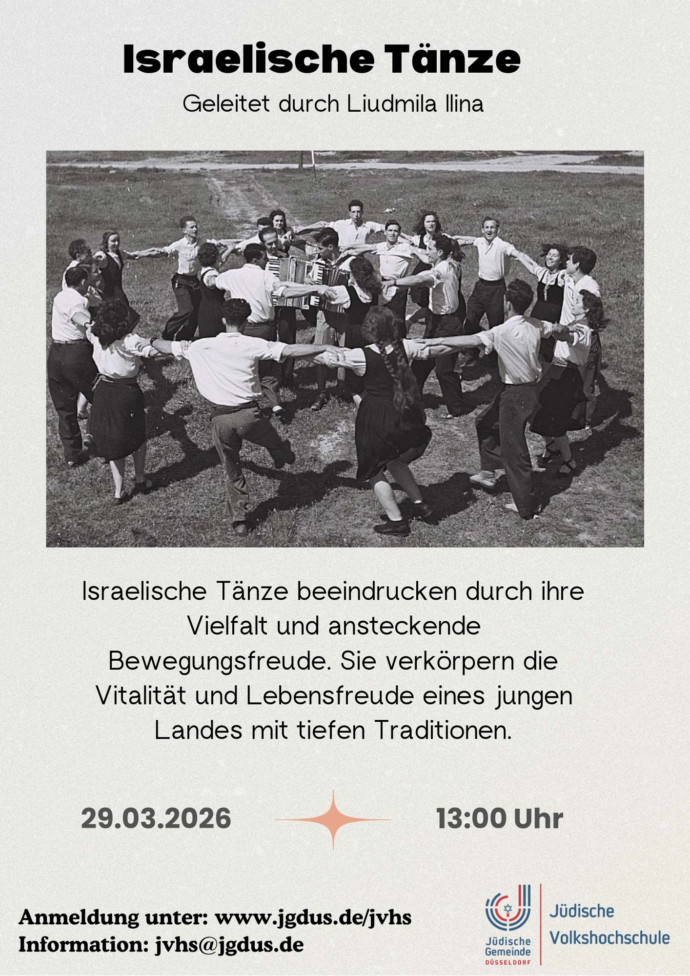zur AnmeldungIsraelische Tänze beeindrucken durch ihre Vielfalt und ansteckende Bewegungsfreude. Sie verkörpern die Vitalität und Lebensfreude eines jungen Landes mit tiefen Traditionen.